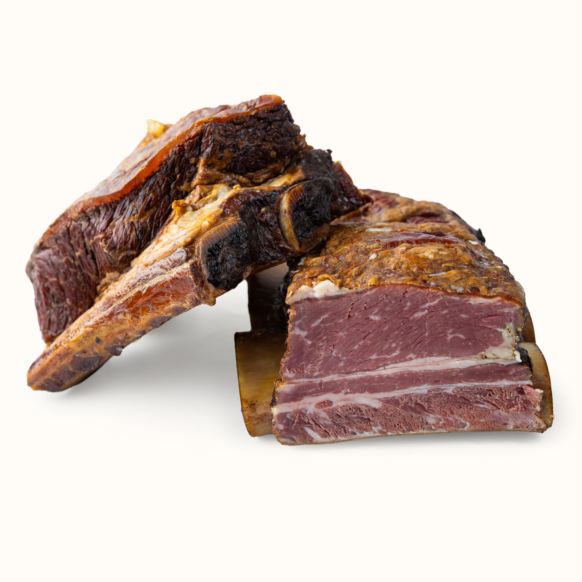 Suché zrání je tradiční a náročnější metoda, která vyžaduje čas, trpělivost a precizní podmínky. Maso zraje na kosti s tukovým krytím, ve speciální komoře s řízeným prouděním vzduchu a vlhkosti. Používáme špičkovou italskou technologii Stagionello, která není v Česku moc známá.