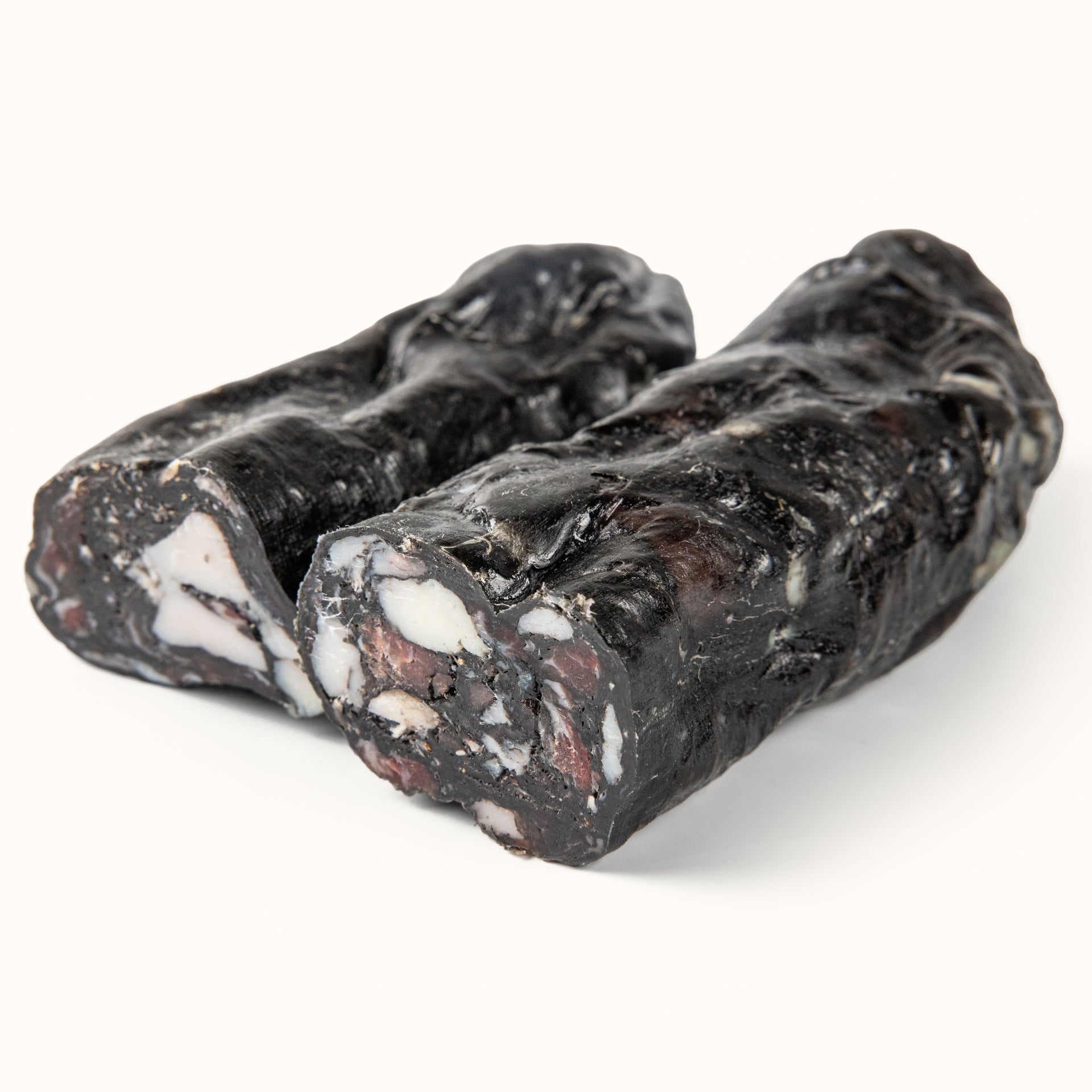 Černý salám - to je náš řemeslný fermentovaný salám, co jde do hloubky! S nezaměnitelným vzhledem a výraznou, plnou chutí. Vyráběn z pečlivě vybraného hovězího a vepřového masa doplněný o vepřové sádlo a vyváženou směs koření. Specifickou barvu získává přidáním přírodního sépiového barviva , které podtrhuje jeho originální charakter. Tak jest, když řemeslo potká odvahu!