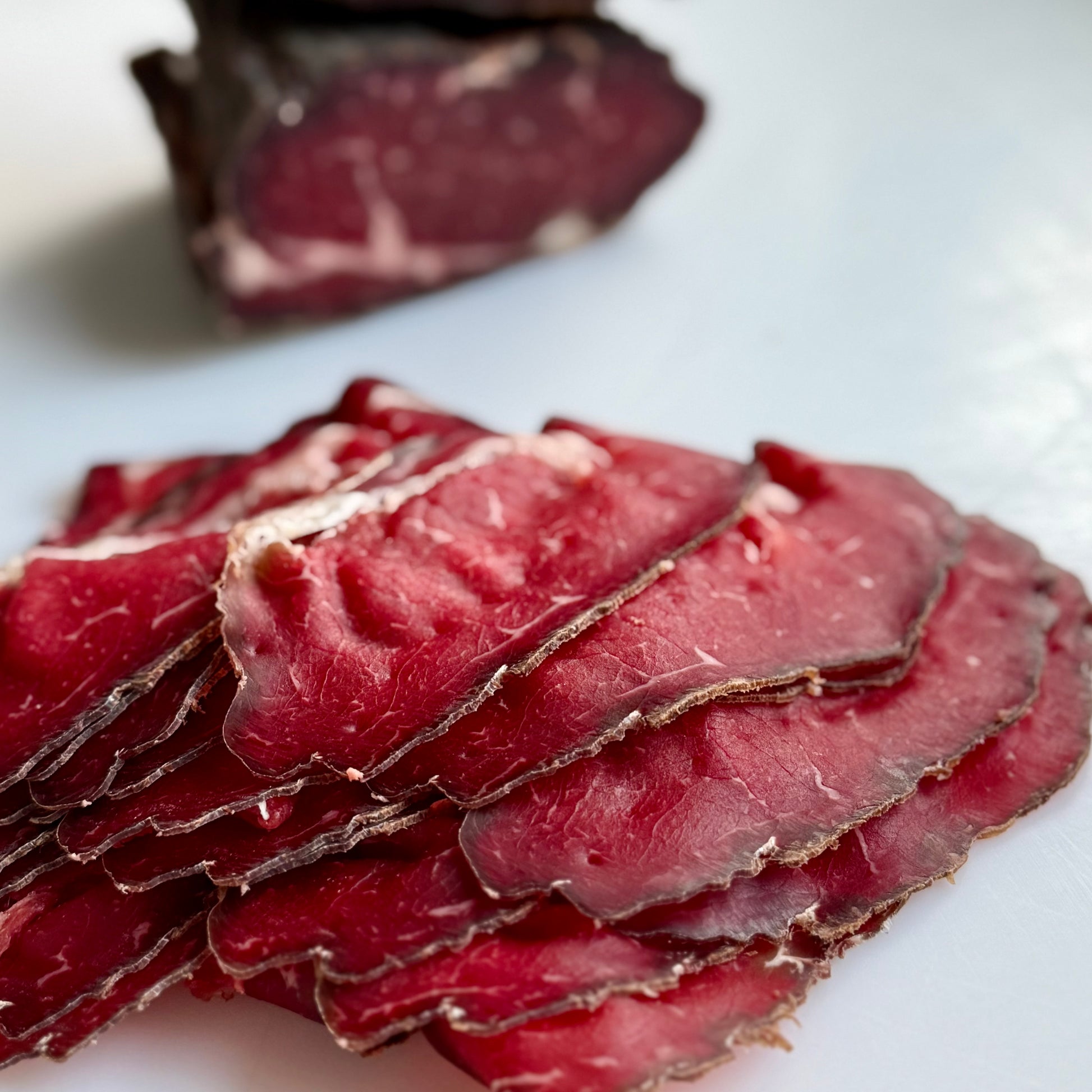Exkluzivní masová delikatesa z pečlivě vybrané hovězí roštěné, připravovaná tradičním pomalým sušením a jemným zauzením. Maso se krájí na tenké, téměř průsvitné plátky, které vynikají plnou chutí. Ideální volba na luxusní prkénko k vínu nebo jako výjimečné gurmánské pohoštění.
